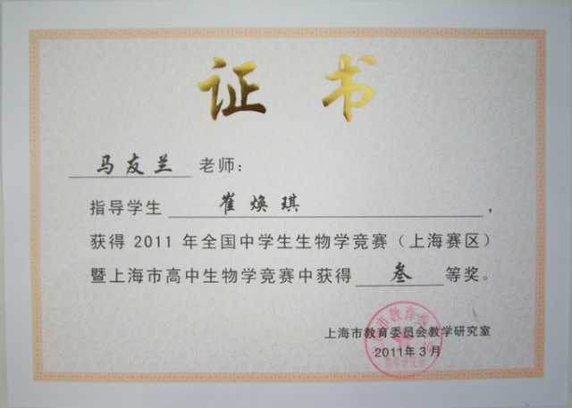 2011.03马友兰----指导的学生崔焕琪获2011年全国中学生生物学竞赛(上海赛区)暨上海市高中生物学竞赛三等奖(证书).jpg