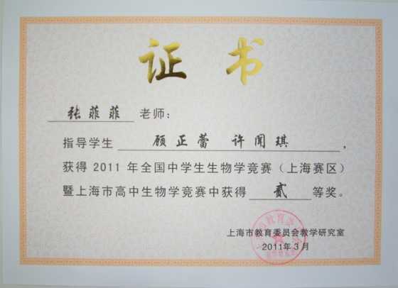 2011.03张菲菲----指导的学生顾正蕾、许闻琪获2011年全国中学生生物学竞赛(上海赛区)暨上海市高中生物学竞赛二等奖(证书).jpg