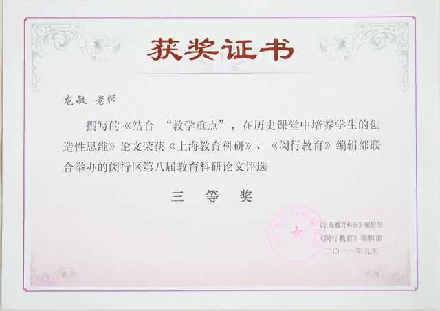 2011.09龙敏----《结合“教学重点”,在历史课堂中培养学生的创造性思维》获闵行区第八届教育科研论文评选三等奖(证书).jpg