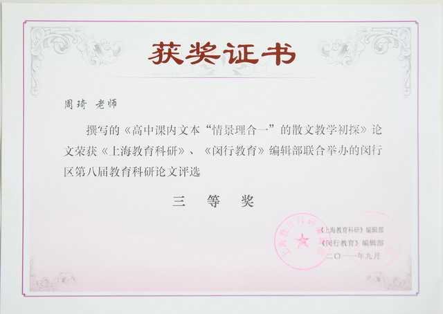2011.09周琦----《高中课内文本“情景理合一”的散文教学初探》获闵行区第八届教科研论文评选三等奖(证书).jpg