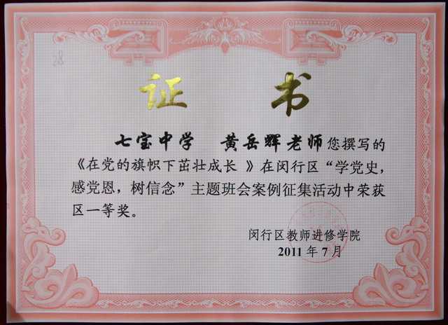2011.07黄岳辉----撰写的《在党的旗帜下茁壮成长》获闵行区“学党史,感党恩,树信念”主题班会案例一等奖(证书).jpg