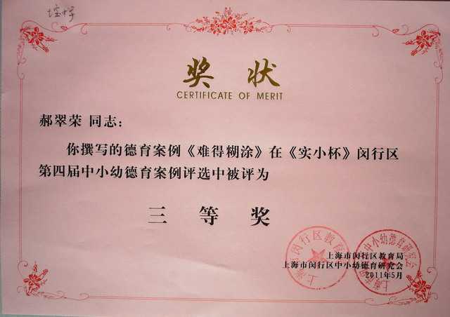 2011.05郝翠荣----案例《难得糊涂》获《实小杯》闵行区第四届中小幼德育案例评选三等奖(奖状).jpg