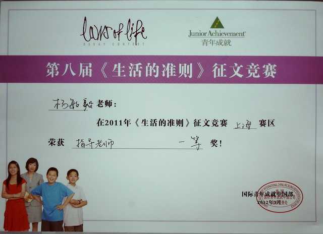 杨敏毅----获2011年《生活的准则》征文竞赛上海赛区指导老师一等奖(证书)