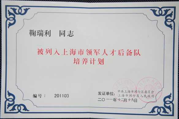 鞠瑞利----被列入上海市领军人才后备队培养计划(证书)