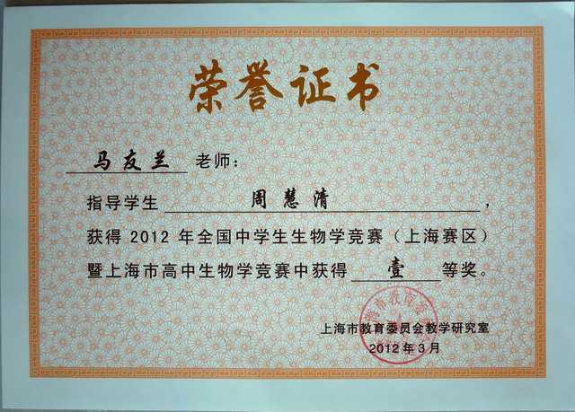 2012.03马友兰---指导的周慧清同学获2012年全国中学生生物学竞赛(上海赛区)暨上海市高中生物学竞赛一等奖(证书).jpg