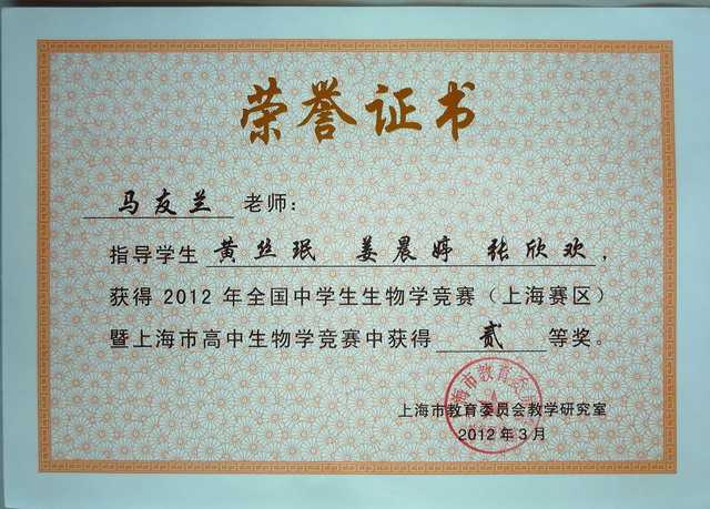 2012.03马友兰---指导的黄丝珉、姜晨婷、张欣欢等同学获2012年全国中学生生物学竞赛(上海赛区)暨上海市高中生物学竞赛二等奖(证书)1.jpg
