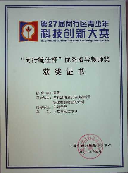 2012.05高俊----获第27届闵行区青少年科技创新大赛“闵行毓佳杯”优秀指导教师奖(证书)(指导学生 牟姚子野).jpg