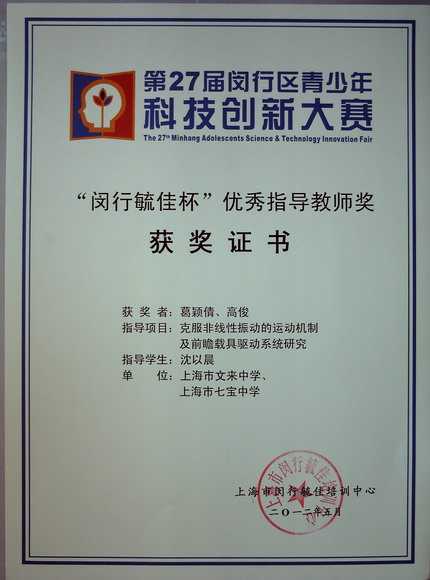 2012.05葛颖倩、高俊----获第27届闵行区青少年科技创新大赛“闵行毓佳杯”优秀指导教师奖(证书)(指导学生 沈以晨).jpg