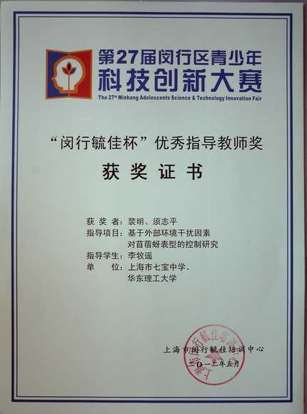 2012.05裴明、须志平----获第27届闵行区青少年科技创新大赛“闵行毓佳杯”优秀指导教师奖(证书)(指导学生 李牧遥).jpg