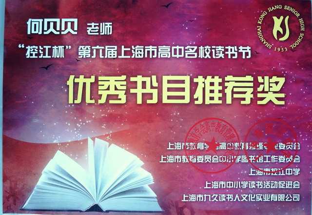 2012.05何贝贝----获“控江杯”第6届上海市高中名校读书节优秀书目推荐奖(证书).jpg