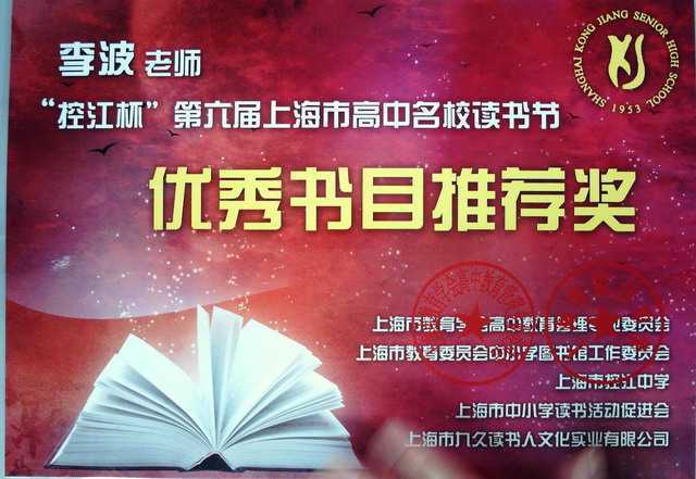 2012.05李波----获“控江杯”第6届上海市高中名校读书节优秀书目推荐奖(证书).jpg