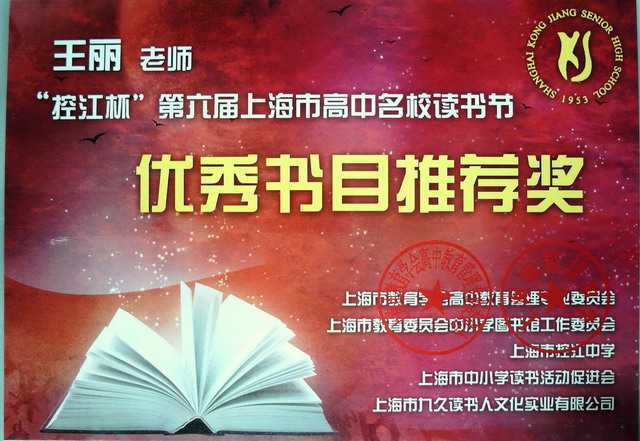 2012.05王丽----获“控江杯”第6届上海市高中名校读书节优秀书目推荐奖(证书).jpg