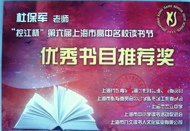 杜保军、王丽、李波、何贝贝----获“控江杯”第6届上海市高中名校读书节优秀书目推荐奖(证书)