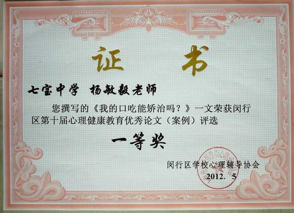 2012.05杨敏毅----《我的口吃能矫治吗》获区第10届心理健康教育优秀论文(案例)一等奖(证书).jpg