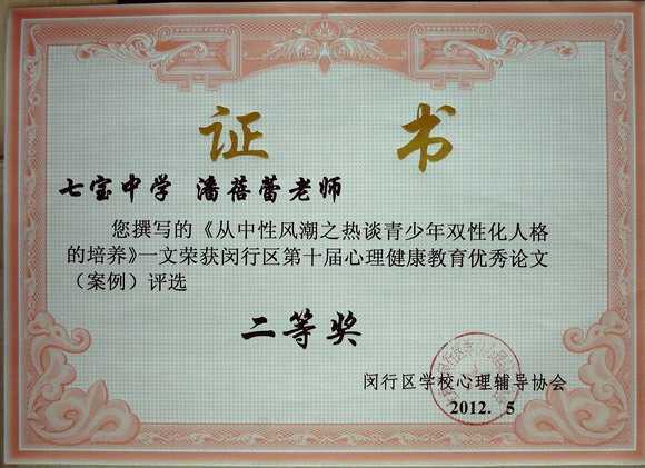 2012.05潘蓓蕾----《从中性风潮之热谈青少年双性化人格的培养》获区第10届心理健康教育优秀论文(案例)二等奖(证书).jpg