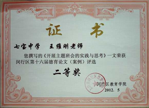 王维刚----《开展主题班会的实践与思考》获闵行区第16届德育论文(案例)二等奖(证书)