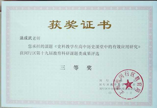 2012.03逯成武----承担的课题《史料教学在高中历史课堂中的有效应用研究》获区第19届教育科研课题类成果三等奖(证书).jpg