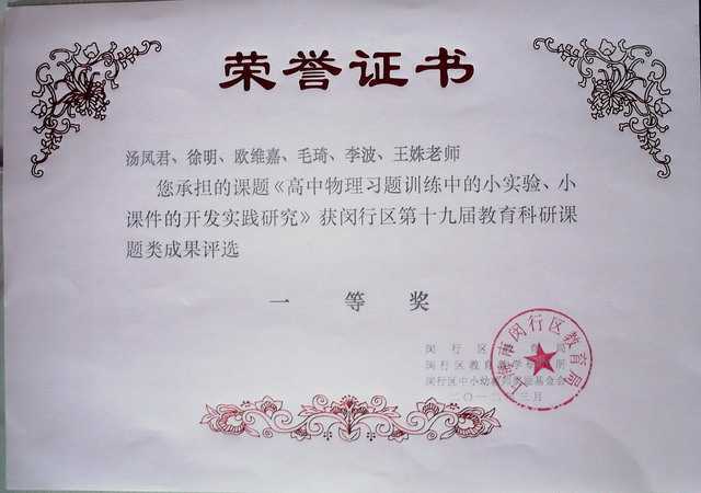 2012.03汤凤君、徐明、欧维嘉、毛琦、李波、王姝----承担的课题《高中物理习题训练中的小实验、小课件的开发实践研究》获区第19届教育科研课题类成果一等奖(证书).jpg