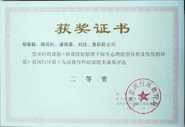 2012.03杨敏毅、鞠瑞利、潘蓓蕾、刘欣、黄莉莉----承担的课题《沙盘投射原理下师生心理原型分析及优化的研究》获区第19届教育科研课题类成果二等奖(证书).jpg