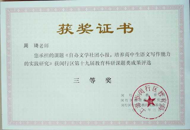 2012.03周琦----承担的课题《自办文学社团小报,培养高中生语文写作能力的实践研究》获区第19届教育科研课题类成果三等奖(证书).jpg