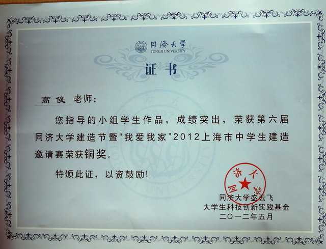 高俊----指导的学生获第六届同济大学建造节暨“我爱我家”2012上海市中学生建造邀请赛铜奖(证书)