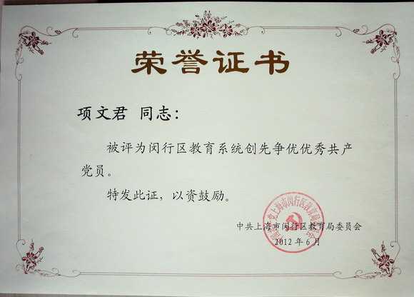 2012.06项文君----被评为闵行区教育系统创先争优优秀共产党员(证书).jpg