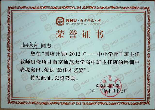 2012.10姚成平----获“国培计划(2012)”中小学骨干班主任教师研修项目南京师范大学高中班主任培训“最佳才艺奖”(证书).jpg