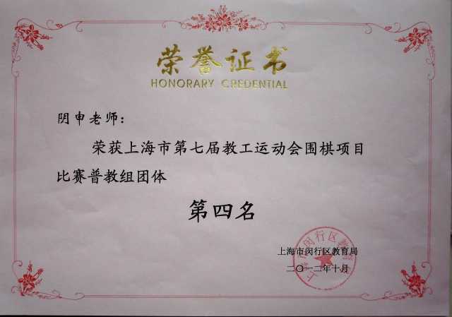 阴申----获上海市第七届教工运动会围棋项目比赛普教组团体第四名(证书)