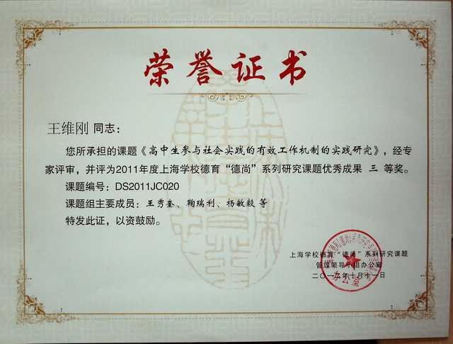 2012.10王维刚----承担的课题《高中生参与社会实践的有效工作机制的实践研究》评为2011年度上海学校德育“德尚”系列研究课题优秀成果三等奖(证书).jpg