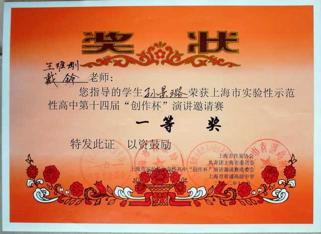 2012.11王维刚、戴玲----指导的学生孙景璐获上海市实验性示范性高中第14届“创作杯”演讲一等奖(奖状).jpg