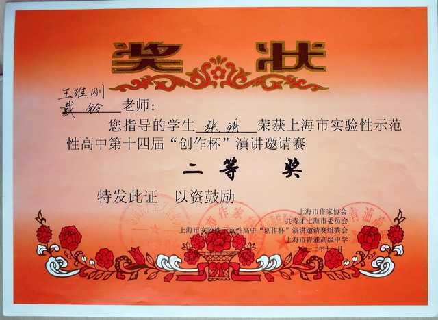 2012.11王维刚、戴玲----指导的学生张玥获上海市实验性示范性高中第14届“创作杯”演讲二等奖(奖状).jpg