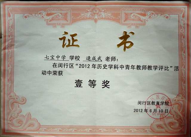 逯成武----获闵行区2012年历史学科中青年教师教学评比一等奖(证书)