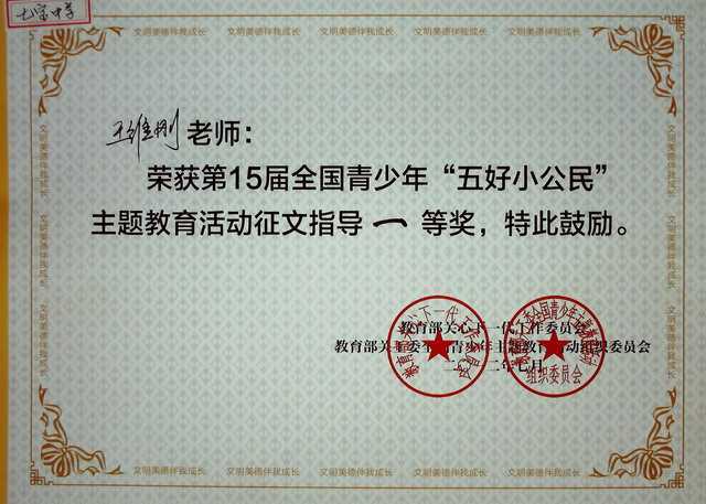 2012.07王维刚----获第15届全国青少年五好小公民主题教育活动征文指导一等奖(证书).jpg