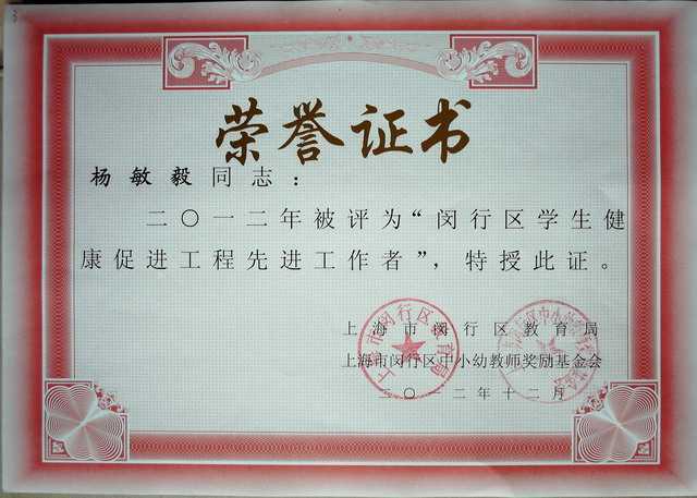 杨敏毅----被评为2012年“闵行区学生健康促进工程先进工作者”(证书)