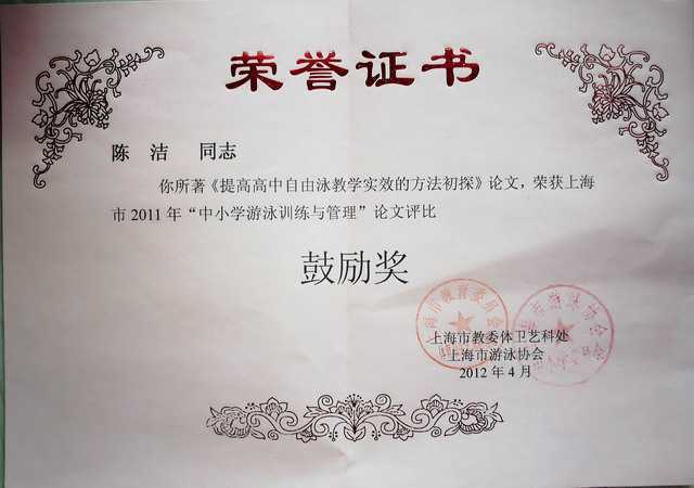 2012.04陈洁----《提高高中自由泳教学实效的方法初探》获上海市2011年“中小学游泳训练与管理”论文评比鼓励奖(证书).jpg