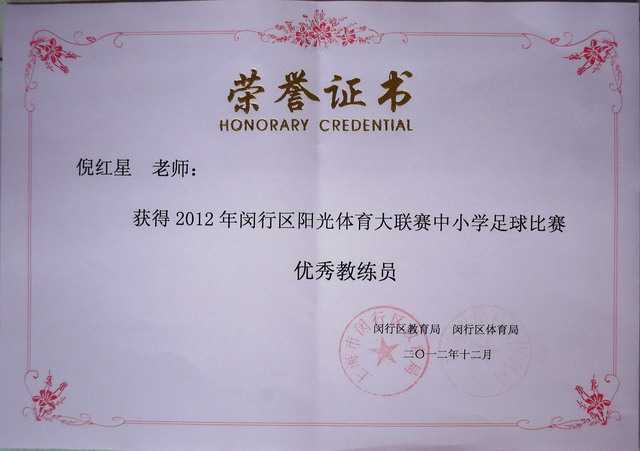 倪红星----获2012年闵行区阳光体育大联赛中小学足球比赛优秀教练员(证书)