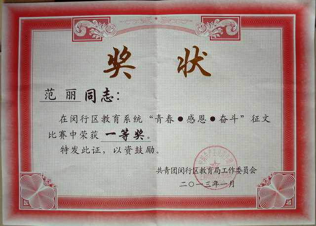2013.01范丽----获闵行区教育系统“青春.感恩.奋头”征文比赛一等奖(奖状)