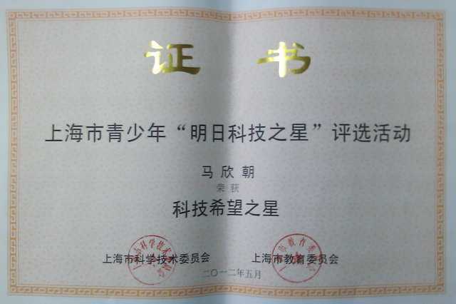 马欣朝----获上海市青少年“明日科技之星”评选:科技希望之星(证书)(指导老师:裴明)