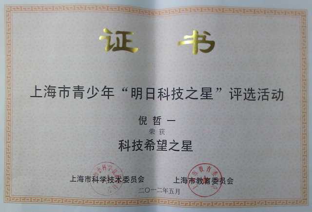 倪哲一----获上海市青少年“明日科技之星”评选:科技希望之星(证书)(指导老师:裴明)