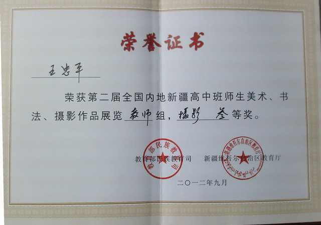 2012.09王忠平----获第二届全国内地新疆高中班师生美术、书法、摄影作品展览(教师组)摄影三等奖(证书).jpg