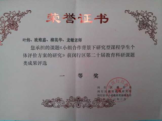 2013.03叶纬、欧维嘉、柳英华、龙敏----承担的课题《小组合作背景下研究型课程学生个体评价方案的研究》获得闵行区第20届科研成果评选一等奖(证书).jpg