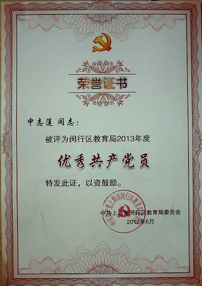 2013.06申志莲----评为闵行区教育局2013年度优秀共产党员(证书).jpg