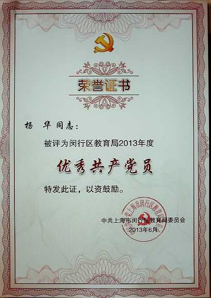 2013.06杨华----评为闵行区教育局2013年度优秀共产党员(证书).jpg
