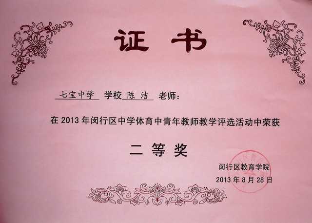 2013.08陈洁----获2013年闵行区中学体育中青年教师教学评选二等奖(证书).jpg