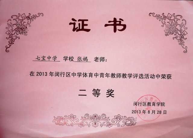 2013.08张嫣----获2013年闵行区中学体育中青年教师教学评选二等奖(证书).jpg