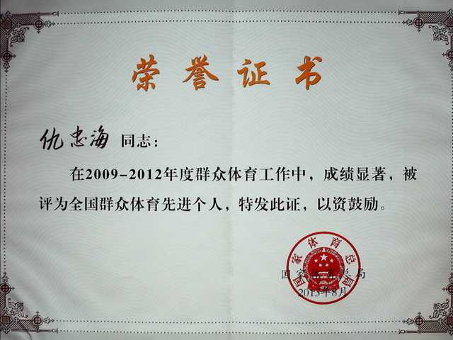 仇忠海----被评为2009-2012年度全国群众体育先进个人(证书)