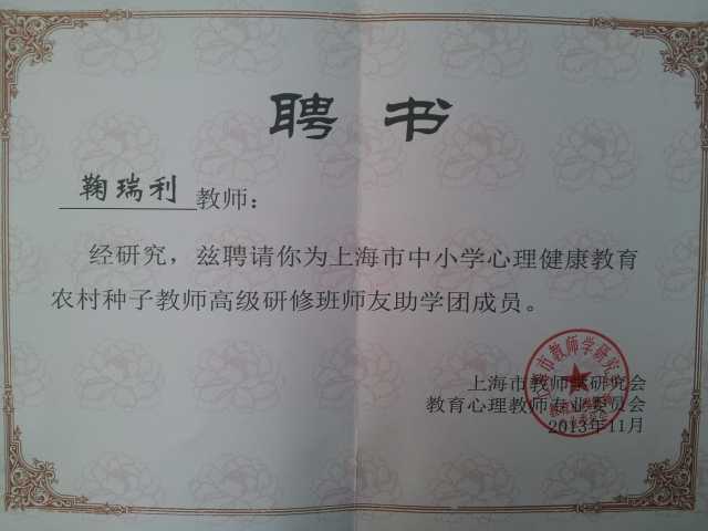 2013.11鞠瑞利----被聘为上海市中小学心理健康教育农村种子教师高级研修班师友助学团成员(聘书).jpg