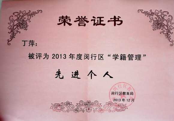 2013.12丁萍----被评为2013年度闵行区“学籍管理”先进个人(证书).jpg