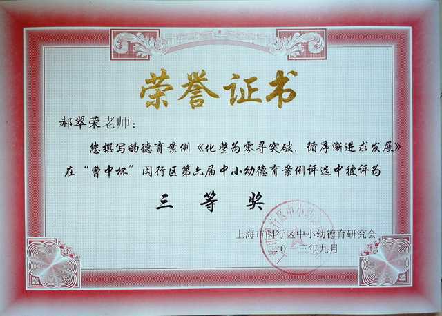 2013.09郝翠荣----《化整为零导突破,德育渐进求发展》获“曹中杯”闵行区第7届中小幼德育案例三等奖(证书).jpg