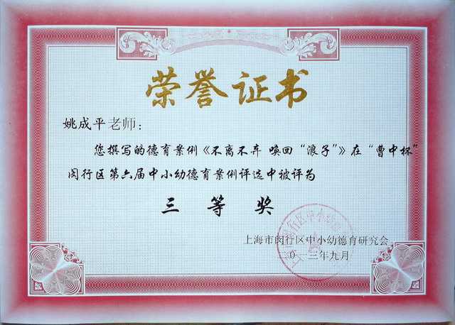 2013.09姚成平----《不离不弃唤回“浪子”》获“曹中杯”闵行区第10届中小幼德育案例三等奖(证书).jpg